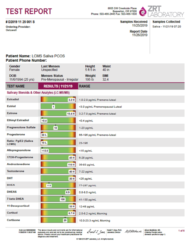 Le test LCMS Steroid Profile du laboratoire ZRT est une évaluation avancée de 18 hormones stéroïdiennes utilisant la technologie de spectrométrie de masse en tandem avec la chromatographie liquide (LC-MS/MS). Cette méthode offre une analyse extrêmement précise et détaillée des niveaux hormonaux et de leurs métabolites. Ce test est particulièrement utile pour fournir une évaluation approfondie des fonctions ovariennes et surrénaliennes.